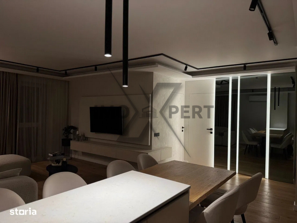 Acest apartament se remarcă printr-un concept modern de iluminat, gândit nu doar funcțional, ci și scenografic. Multiplele surse de lumină permit crearea unor scenarii variate, adaptate stilului de viață și momentului zilei.