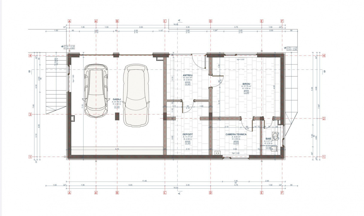 Demisol: garaj dublu, 1 birou, 1 baie, 1 camera tehnica, 1 camera depozitare